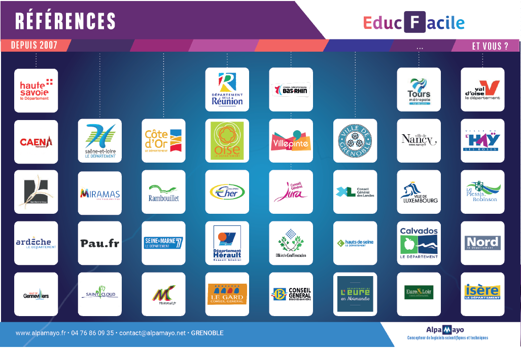 - Les départements : Charente, Ain, Val d'Oise, Oise, Eure, Eure-et-Loir, Cher, Calvados, Nord, Landes, Jura, Hauts-de-Seine, Seine et Marne, Isère, Ardèche, Haute Savoie, Saône et Loire, Côte d'Or, La Réunion, Bas-Rhin